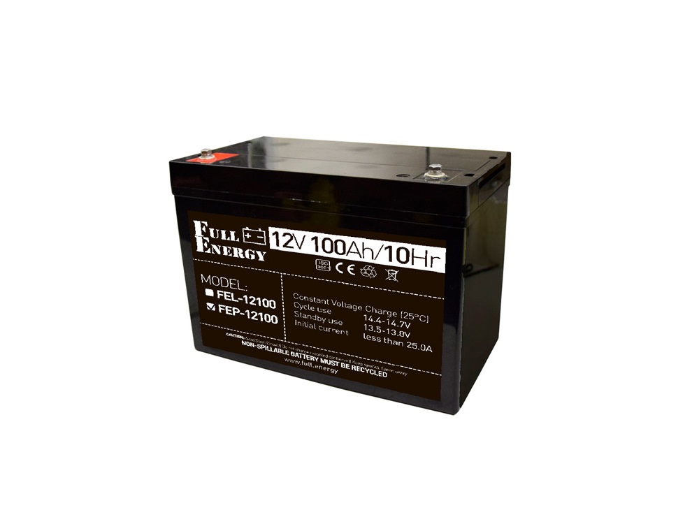 Full Energy FEP-12100 застосовується для установки в безперебійні блоки живлення, пульти охоронної сигналізації і т. п. виконаний в герметичному корпусі за технологією AGM (Absorbent Glass Mat). Дана технологія передбачає використання не рідкого, а абсорбованого електроліту. Безпечний для використання в житлових приміщеннях, так як AGM акумулятор практично не виділяє шкідливих або небезпечних газів і не вимагає обслуговування протягом всього терміну служби. Призначений для систем безперебійного живлення та для систем резервного живлення (ДБЖ, інвертори та інше).