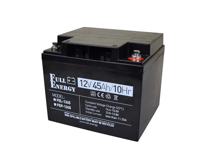 Full Energy FEP-1245 застосовується для установки в безперебійні блоки живлення, пульти охоронної сигналізації і т. п. виконаний в герметичному корпусі за технологією AGM (Absorbent Glass Mat). Дана технологія передбачає використання не рідкого, а абсорбованого електроліту. Безпечний для використання в житлових приміщеннях, так як AGM акумулятор практично не виділяє шкідливих або небезпечних газів і не вимагає обслуговування протягом всього терміну служби. Призначений для систем безперебійного живлення та для систем резервного живлення (ДБЖ, інвертори та інше).
