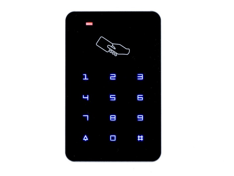 Контроллер оснащен сенсорной цифровой клавиатурой и встроенным считывателем, благодаря которому можно записать в память устройства до 1000 карт доступа Em-Marine. К данному контроллеру можно подключить кнопку выхода и электрозамок с помощью встроенного реле NC/NO. Клавиши могут подсвечиваться в темноте.