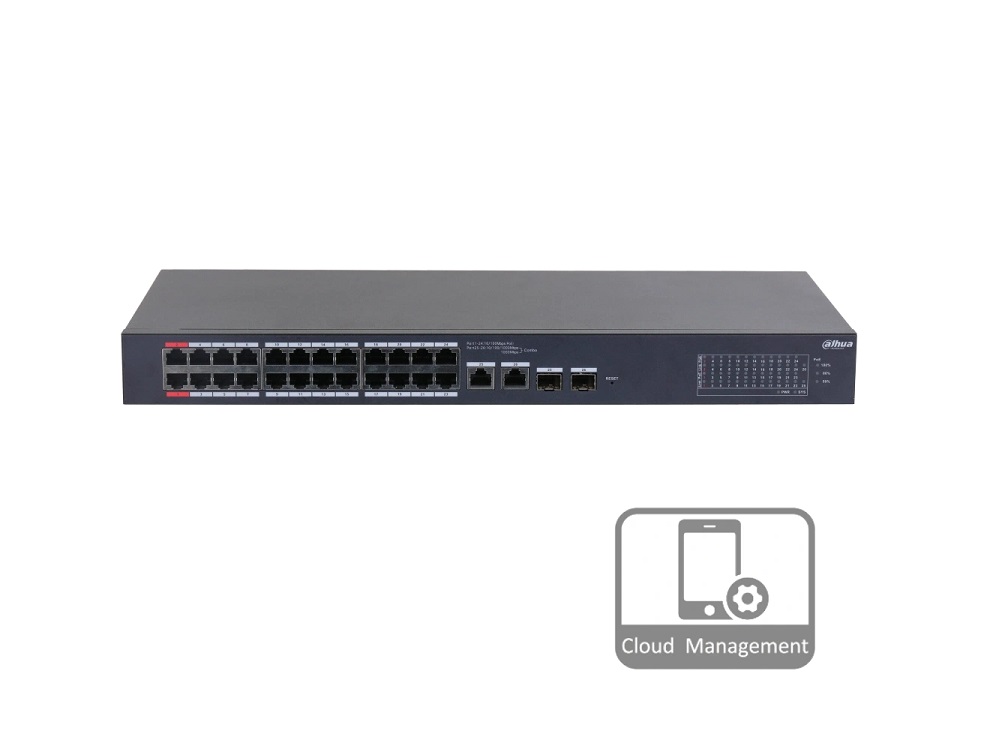 24-портовий POE комутатор Dahua DH-CS4226-24ET-375 призначений для підключення по мережі і живлення ip систем з підтримкою технології PoE стандартів IEEE802.3af (PoE), IEEE802.3at (PoE+), Hi-PoE. Комутатор оснащений 24 100 Mbit Ethernet-портами з підтримкою PoE, 2 Combo Gigabit Ethernet/SFP-портами для підключення до мережі інтернет або до інших мережевих пристроїв. Комутатор керований, налаштувати та обслуговувати його можливо віддаленно за допомогою Cloud-сервісу DoLynk Care app на смартфонах.