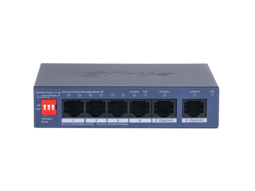 4-портовий POE комутатор Dahua DH-CS4006-4ET2GT-36 призначений для підключення по мережі і живлення ip систем з підтримкою технології PoE стандартів IEEE802.3af (PoE), IEEE802.3at (PoE+). Комутатор оснащений 4 100 Mbit Ethernet-портами з підтримкою PoE, 2 Gigabit Ethernet-портами для підключення до мережі інтернет або до інших мережевих пристроїв. Комутатор керований, налаштувати та обслуговувати його можливо віддаленно за допомогою Cloud-сервісу DoLynk Care app на смартфонах. Функція Watchdog допомагає автоматично відновлювати роботу комутатора при збої в мережі.