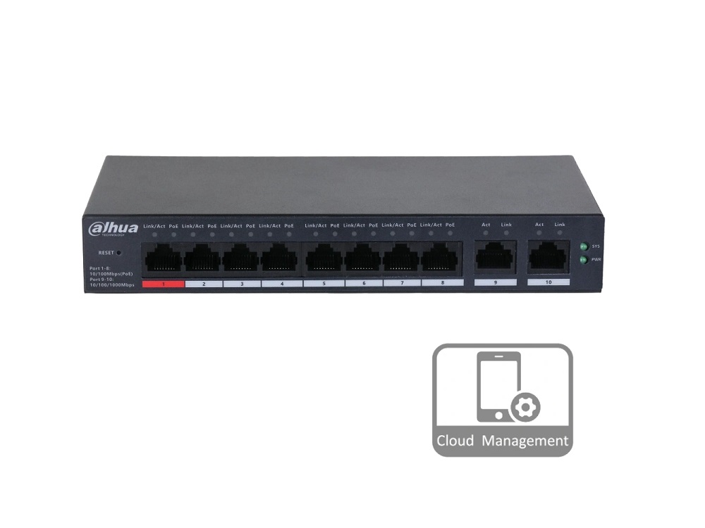 8-портовий POE комутатор Dahua DH-CS4010-8ET-60 призначений для підключення по мережі і живлення ip систем з підтримкою технології PoE стандартів IEEE802.3af (PoE), IEEE802.3at (PoE+), Hi-PoE. Комутатор оснащений 8 100 Mbit Ethernet-портами з підтримкою PoE, 2 Gigabit Ethernet-портами для підключення до мережі інтернет або до інших мережевих пристроїв. Комутатор керований, налаштувати та обслуговувати його можливо віддаленно за допомогою Cloud-сервісу DoLynk Care app на смартфонах.