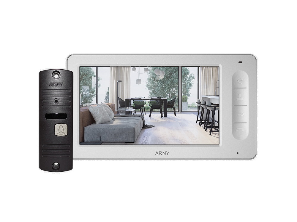 Комплект видеодомофона ARNY AVD-7006 - новый бюджетный комплект от бренда Arny, в состав которого входит цветной видеодомофон Arny AVD-706 (в белом или черном цвете) с диагональю 7" и вызывная видеопанель Arny AVP-05 (в коричневом, сером или медном цвете). Домофон Arny AVD-706 оснащен встроенной памятью, на которую можно сохранять до 189 фотоснимков, сделанных с вызывной панели.
