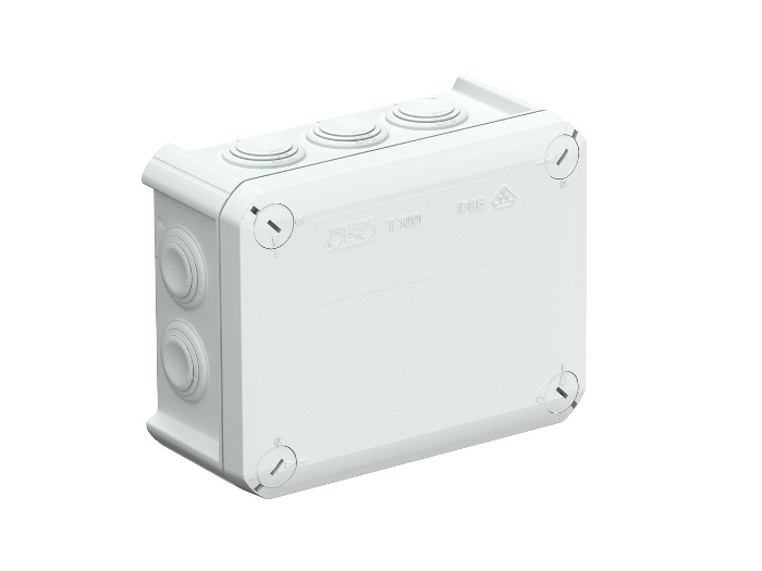Розгалуджуюча коробка Т100 (ОВО Betterman, Німеччина) виробляються з термопласту, який не містить галогену у найрізноманітнішому виконанні. Коробки мають отвори у бокових стінках, які закриті вставними ущільненнями. Кабель або дріт можна безпосередньо ввести через вставні ущільнення в корпусі коробки. Коробки ОВО Betterman можуть бути поруч один з одним, не утворюючи проміжків. Розподільні коробки можуть бути встановлені на пластинах, що підвищуються, у відкриттях на підлозі, використовуючи сталеві гвинти 3,5 х 9,5 мм.