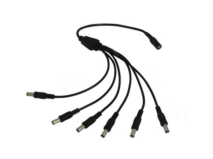 Шнур предназначен для разделения питания на 6 выходов (1 DC female вход на 6 DC male выходов). Каждый разъем DC male имеет наружный диаметр штыря 5,5 мм и внутренний диаметр штыря 2,1 мм. Длина шнура 40 см.