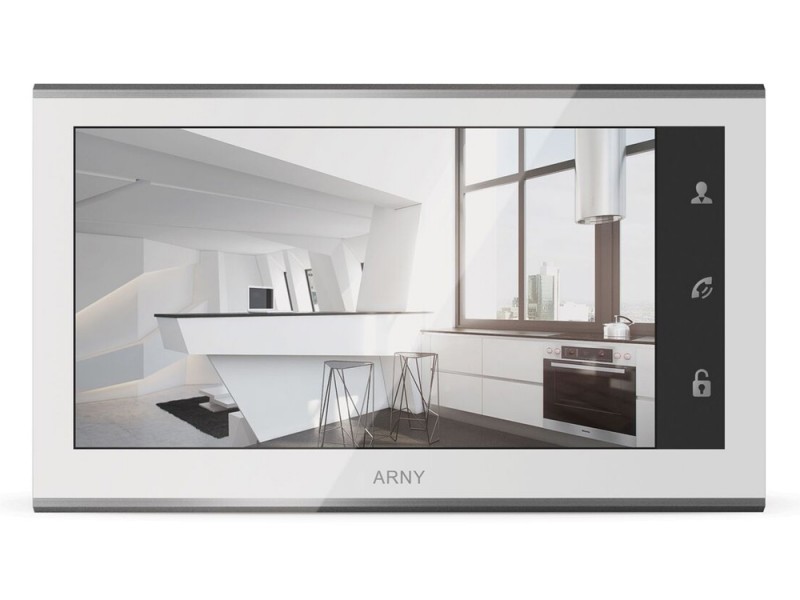 Видеодомофон Arny AVD-730. Аналог старой модели Arny AVD-710, но в совершенно новом дизайне. Имеет тонкий корпус и TFT монитор размером 7 дюймов. Также как и у предшественника есть встроенная память и поддержка карты памяти до 32 Гб. К домофону вы сможете подключить 2 вызывных панели и 2 дополнительных видеокамеры, для максимального контроля, происходящего на объекте. Также присутствует возможность удаленного открытия замка. С помощью встроенного детектора движения, вы всегда сможете видеть кто проходил на вашем объекте, ведь при движении домофон будет автоматически записывать видеоролик.
